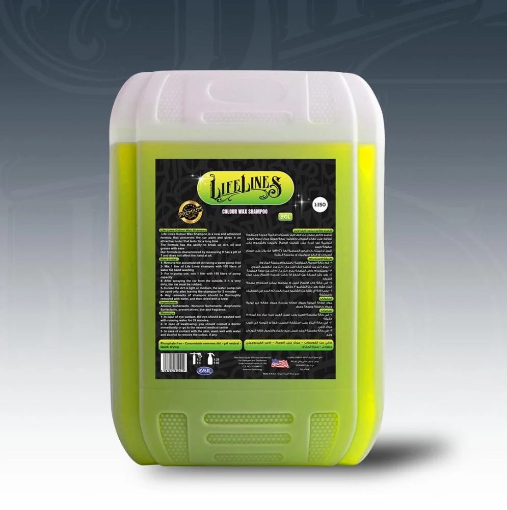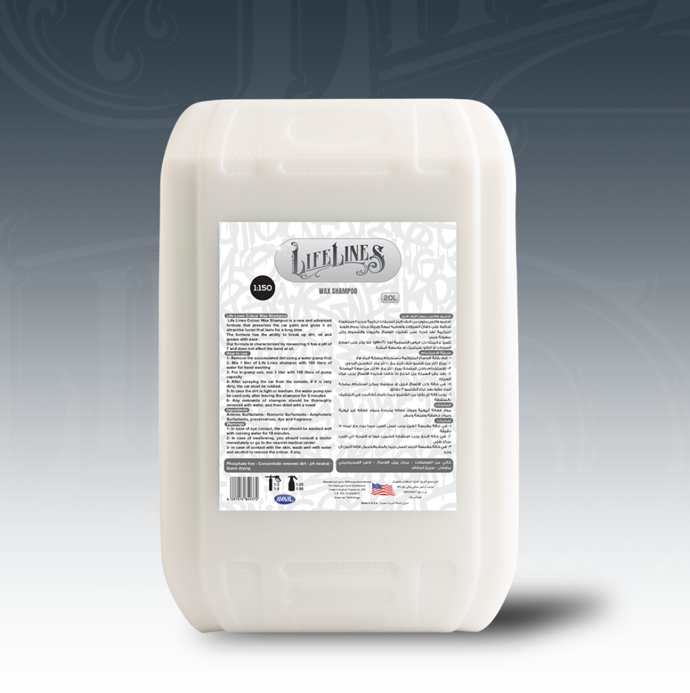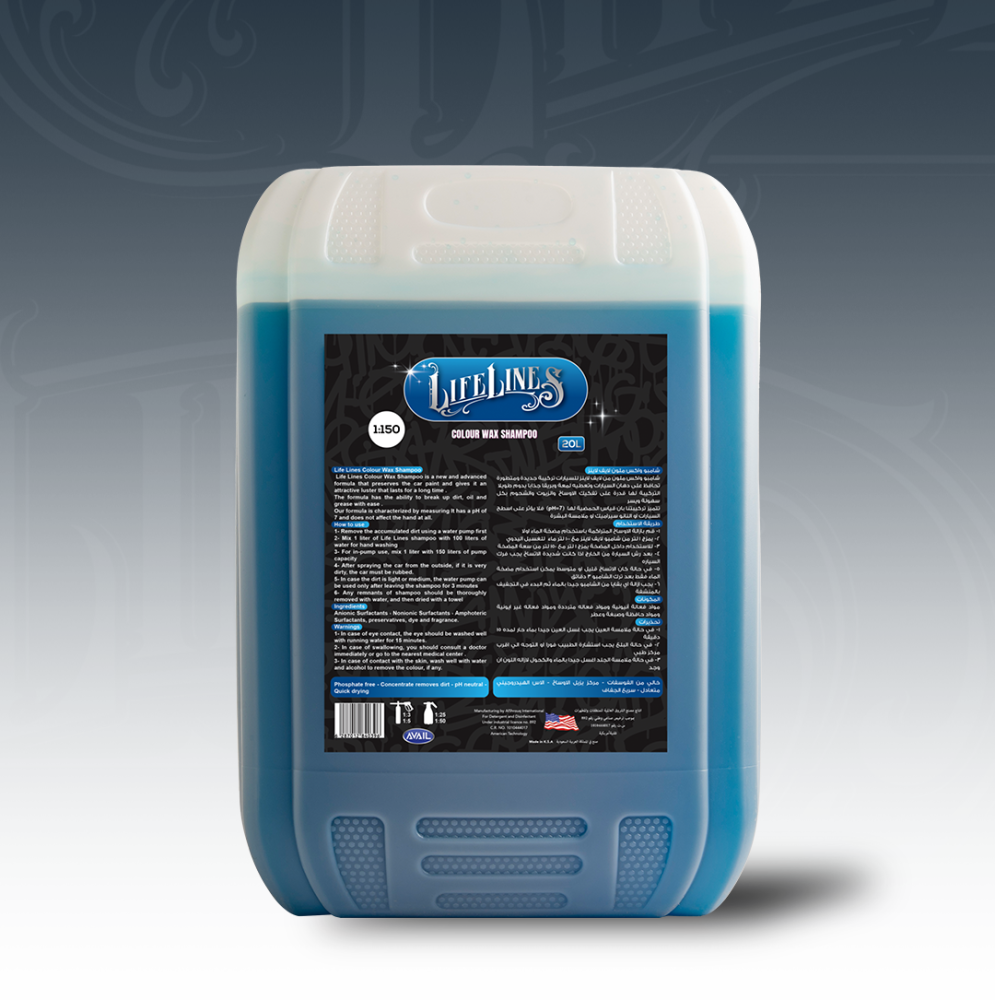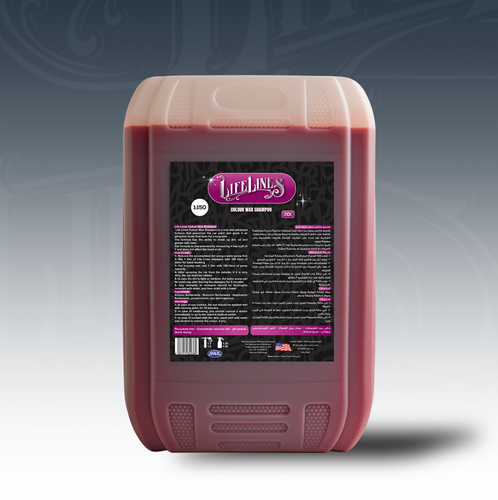 شامبو واكس ملون من لايف لاينز هو الحل الأمثل لغسيل وحماية سيارتك في خطوة واحدة. تم تصميم هذه التركيبة الجديدة والمتطورة خصيصًا لتمنحك لمعة وبريقًا جذابًا يدوم طويلًا، مع الحفاظ على دهان السيارات وتقنية النانو سيراميك دون أي تأثير سلبي. تتميز تركيبتنا القوية بقدرتها الفائقة على تفكيك الأوساخ والزيوت والشحوم بكل سهولة، بينما تحافظ على درجة حمضية متعادلة (pH=7). هذا يعني أنه آمن تمامًا على جميع أسطح السيارة وملامسة البشرة. اختر شامبو واكس لايف لاينز للحصول على نظافة عميقة وحماية دائمة. 🚿 طريقة الاستخدام (غسيل وحماية سريعة) التحضير الأولي: قم بإزالة الأوساخ المتراكمة بالماء أولاً إذا كانت شديدة. للتخفيف اليدوي: يمزج 1 لتر من شامبو لايف لاينز مع 100 لتر من الماء. للمضخات الاحترافية: يمزج 1 لتر مع 150 لتر من سعة المضخة. التطبيق والفرك: بعد رش السيارة، يفضل فركها إذا كانت شديدة الاتساخ. الشطف: في حال الاتساخ القليل/المتوسط، يمكن استخدام مضخة الماء فقط بعد ترك الشامبو 3 دقائق. التجفيف: يجب إزالة أي بقايا من الشامبو جيدًا بالماء، ثم البدء في التجفيف بمنشفة نظيفة. ⚠️ تحذيرات السلامة في حالة ملامسة العين: يجب غسل العين جيدًا بماء جارٍ لمدة 15 دقيقة. في حالة البلع: يجب استشارة الطبيب فوراً أو التوجه إلى أقرب مركز طبي. في حالة ملامسة الجلد: اغسل جيدًا بالماء والكحول لإزالة اللون (إن وجد).