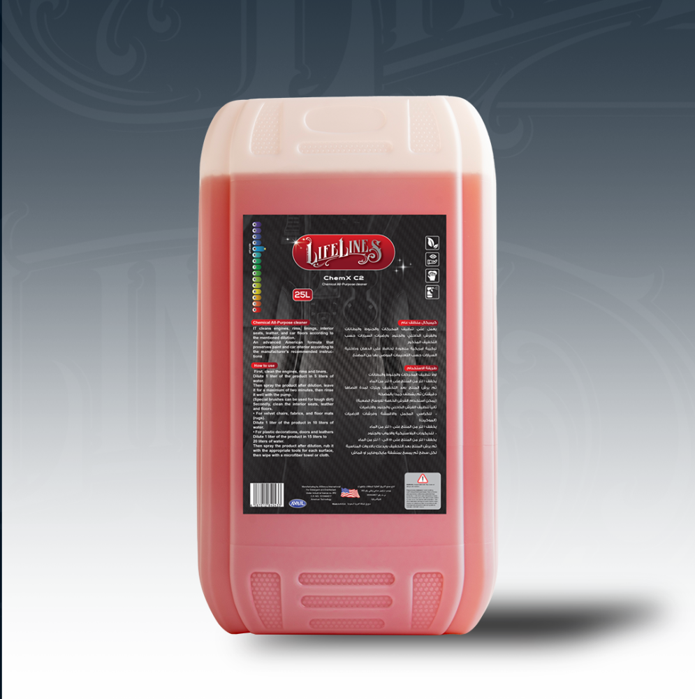 هو المنظف العام للسيارات الذي تحتاجه لكل مهمة تنظيف. بتركيبة أمريكية متطورة، يوفر C2 قوة تنظيف فائقة للمناطق شديدة الاتساخ مثل المحركات، الجنوط، والبطانات، كما يعمل كمنظف آمن وفعال لـ الفرش الداخلي، الجلود، والأرضيات حسب نسب التخفيف الموصى بها. يتميز منظف Chemex C2 بقدرته على إزالة الشحوم والأوساخ العنيدة مع الحفاظ على سلامة دهان السيارة ومواد المقصورة الداخلية، مما يجعله الحل الاقتصادي والمثالي لجميع احتياجات التنظيف. 🛠️ طريقة الاستخدام ونسب التخفيف (APC المركز) ⚠️ المنتج عالي التركيز، يرجى الالتزام بنسب التخفيف لضمان الحفاظ على أسطح السيارة. أولاً: تنظيف المحركات، الجنوط، والبطانات (إزالة الشحوم) 🔹 نسبة التخفيف 1:5 (منتج : ماء) — قوي مثالي لإزالة الشحوم والأوساخ الصعبة في المحركات والجنوط. الطريقة: يُرش المنتج بعد التخفيف ويُترك لمدة أقصاها دقيقتان ثم يُشطف جيداً بالمضخة. (يمكن استخدام فرشاة خاصة للأوساخ الصعبة). ثانياً: تنظيف الفرش الداخلي، الجلود، والأرضيات (تنظيف آمن) 🔹 نسبة التخفيف 1:10 — متوسط مناسب للكراسي المخمل، الأقمشة، وفرشات الأرضيات (الموكيت). 🔹 نسبة التخفيف 1:15 إلى 1:20 — خفيف للديكورات البلاستيكية، الأبواب، والجلود الحساسة. الطريقة: يُرش المنتج بعد التخفيف ويُدعك بالأدوات المناسبة لكل سطح، ثم يُمسح بمنشفة مايكروفايبر أو قطعة قماش نظيفة.