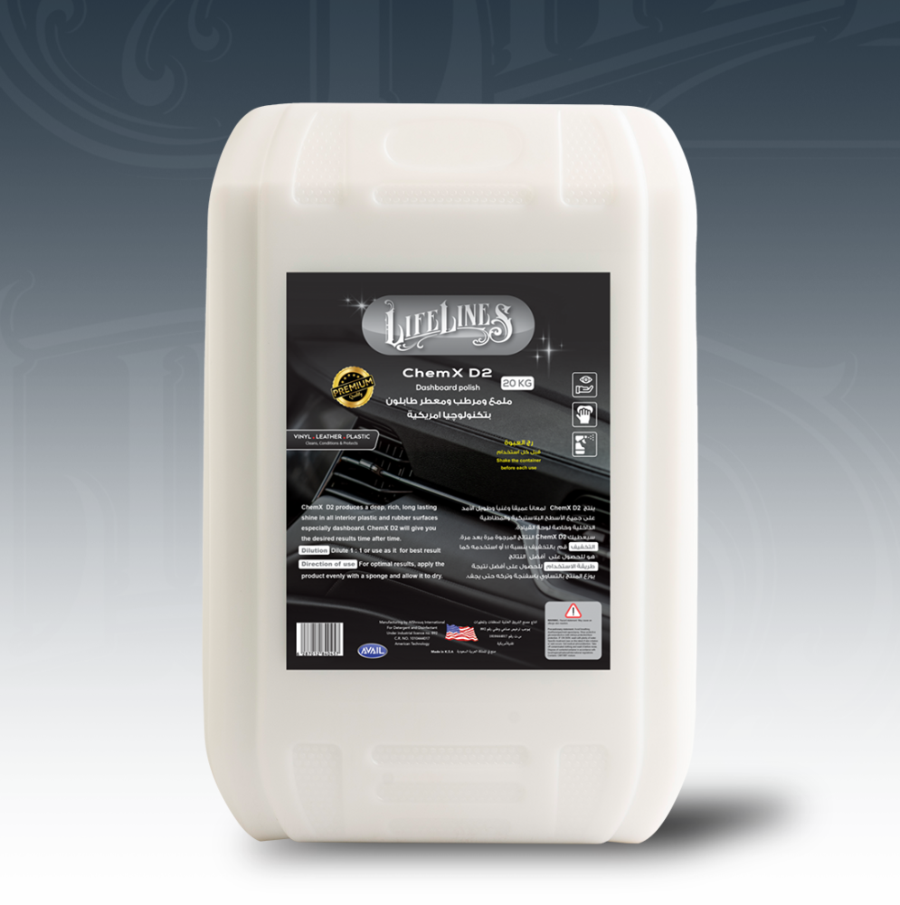 هو ملمع طابلوه لايف لاينز المصمم خصيصاً ليمنح الأجزاء الداخلية لسيارتك لمعاناً عميقاً وغنياً يدوم طويلاً. يخلق هذا المنتج طبقة حماية على جميع الأسطح البلاستيكية والمطاطية الداخلية، وبالأخص لوحة القيادة (التابلوه)، معيداً لها مظهرها الجديد. سواء استخدمته مركزاً للحصول على أقصى لمعة أو مخففاً لـ لمعة طبيعية، فإن ChemX D2 يضمن لك نتائج مثالية ومرضية مرة بعد مرة، مما يحافظ على جمال وأناقة مقصورة سيارتك. ✅ مميزات رئيسية لمعان عميق وغني (Deep Look) للأسطح الداخلية. حماية فعالة للوحة القيادة والبلاستيك الداخلي. يمكن تخفيفه للتحكم بدرجة اللمعان المطلوبة (1:1 أو مركز). مناسب لجميع الأسطح البلاستيكية والمطاطية الداخلية. 🛠️ طريقة الاستخدام (لنتائج احترافية) التخفيف (اختياري): للحصول على أقصى لمعة: استخدم المنتج بدون تخفيف (كما هو). للحصول على لمعة طبيعية: قم بالتخفيف بنسبة 1:1 (جزء من المنتج مقابل جزء من الماء). التطبيق: للحصول على أفضل نتيجة، وزّع المنتج بالتساوي باستخدام إسفنجة نظيفة. التجفيف: اترك المنتج حتى يجف تماماً. (لا يحتاج إلى مسح).