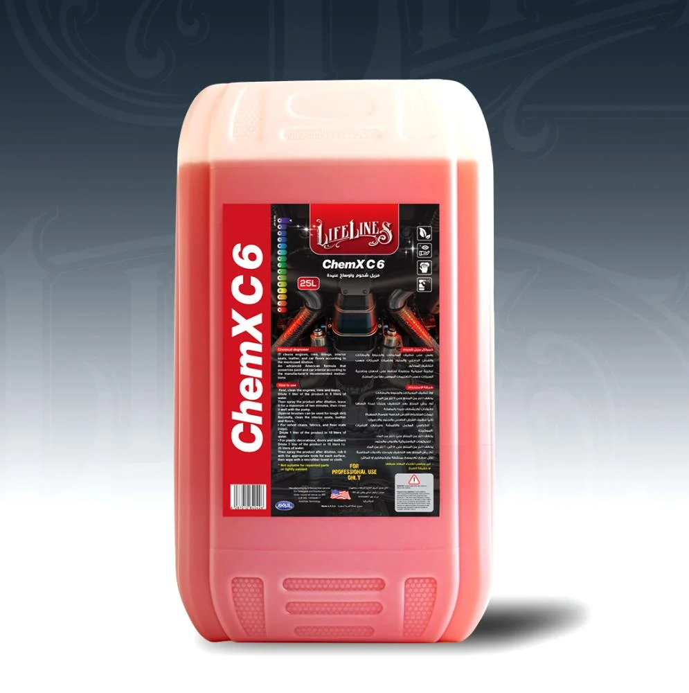 هو مزيل شحوم قوي ومنظف أوساخ عنيدة مصمم بتركيبة احترافية فائقة التركيز، وهو الحل المثالي لعمليات التنظيف الشاقة. يعمل هذا المنظف متعدد الاستخدامات (APC) بفاعلية على إزالة الزيوت والأوساخ العالقة من المحركات والجنوط والمناطق الداخلية مثل الأرضيات والكراسي. يضمن ChemX C6 نتائج واضحة من أول استخدام بفضل قوته العالية. كما يتميز بمرونة كبيرة في الاستخدام؛ فهو آمن وفعال على البلاستيك والجلد عند تخفيفه بالنسب المناسبة، مما يجعله منتجاً أساسياً للمحترفين في حجمه الاقتصادي الكبير 25 لتر. 🛠️ طريقة الاستخدام ونسب التخفيف (للنتائج الاحترافية)